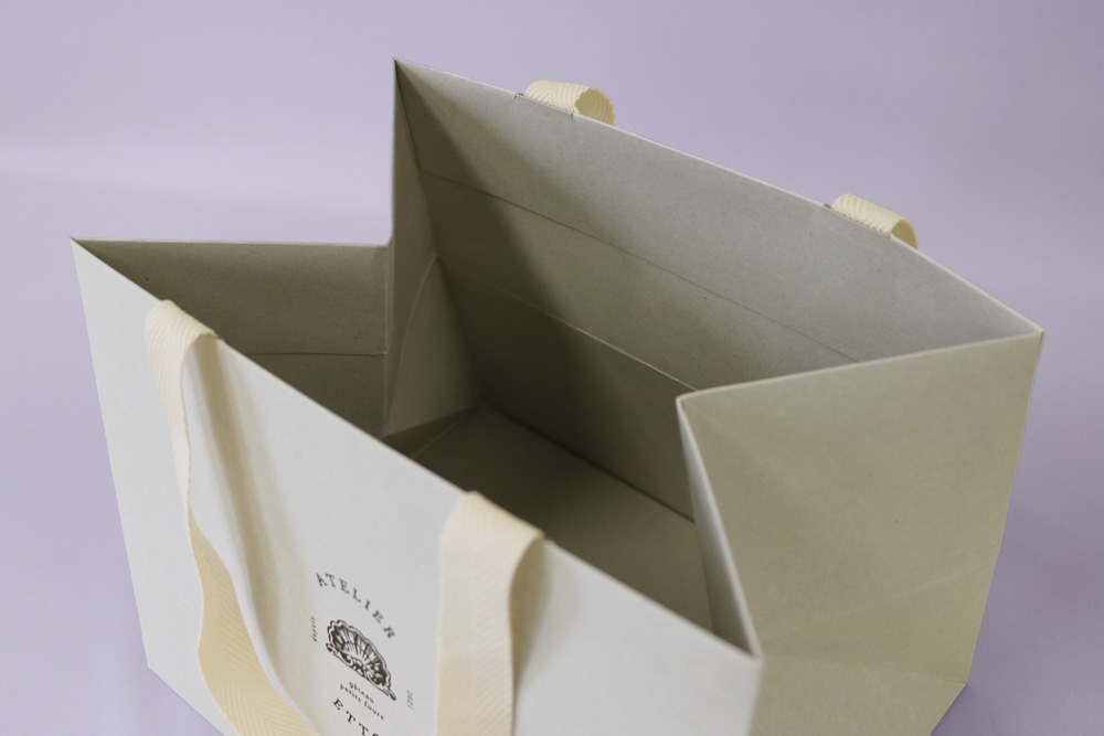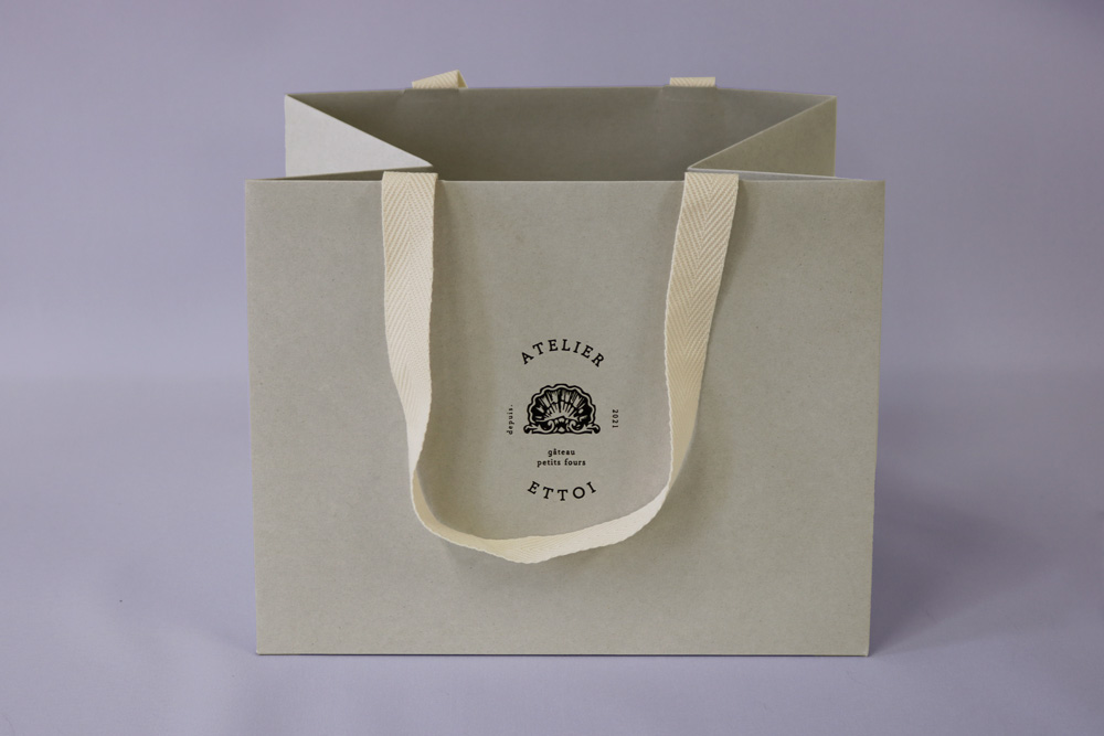 製造ロットは、100枚より既製品にロゴマーク印刷にて対応、オリジナル紙袋は500枚より製造いたします。