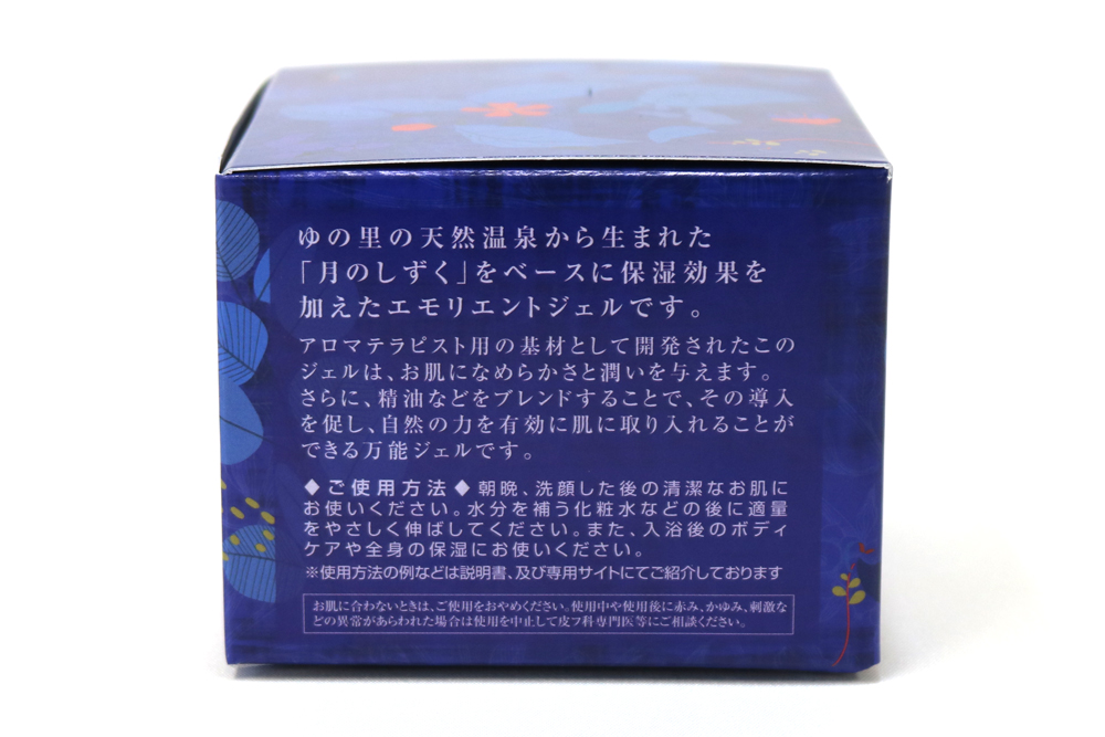 ゆの里の天然温泉から生まれた「月のしずく」をベースに保湿効果を加えたエモリエントジェルです。